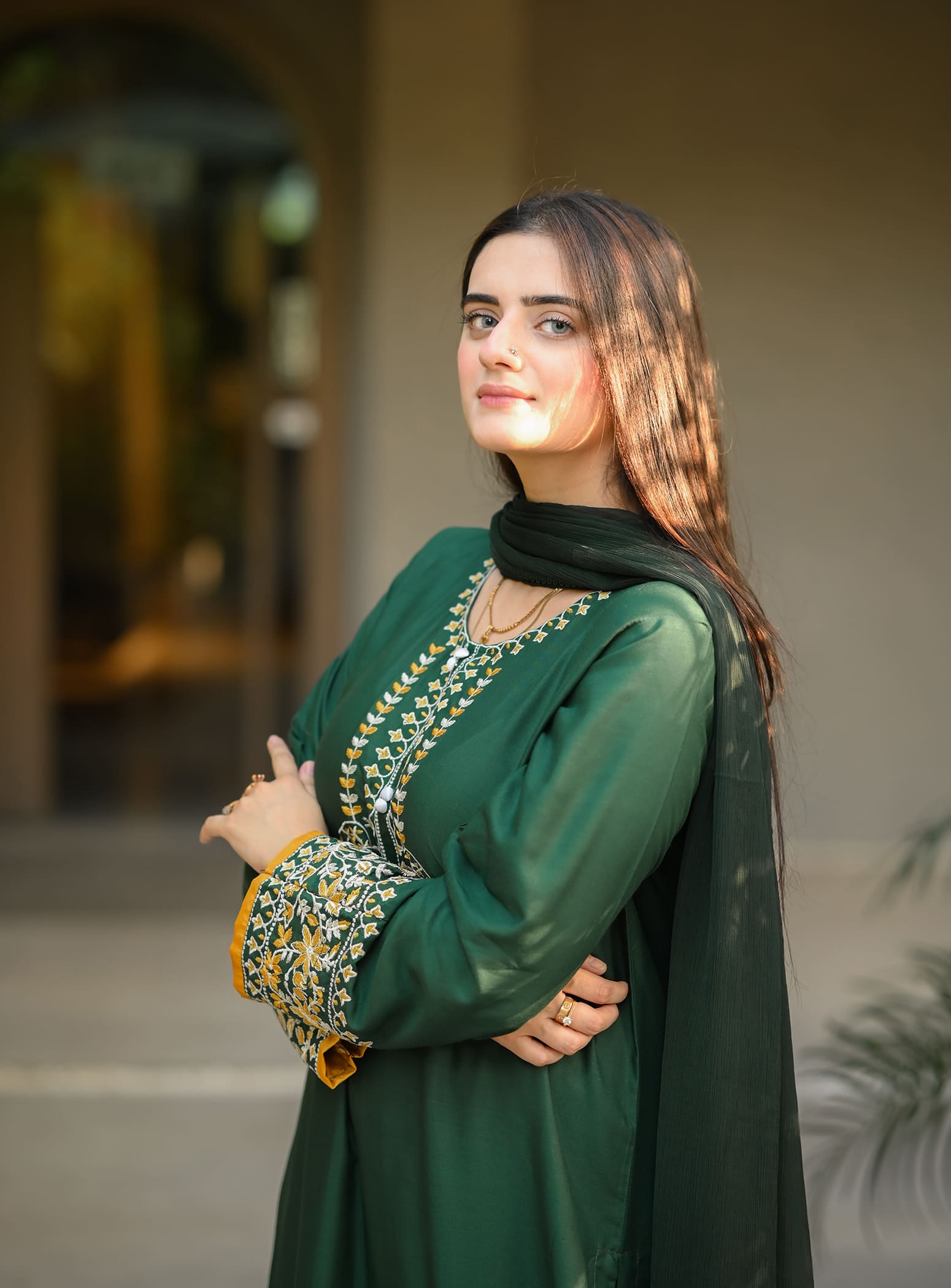 🌟 A chic Mongia Green outfit with embroidery & matching Dupata – designed to make you stand out with effortless grace!